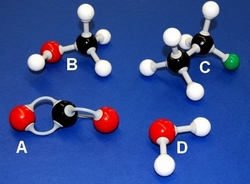 c) S katero črko je označen model delca, ki bi imel molekulsko formulo CH4O?
