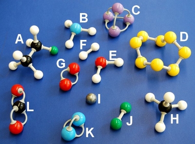Na sliki so modeli delcev različnih snovi označeni s črkami od A do L. Odgovori na vprašanja.