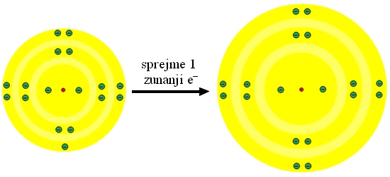 Atom klora ima sedem zunanjih elektronov. Do polne lupine in stabilnega stanja mu manjka en elektron. Poglej, kakšen postane, ko sprejme elektron.