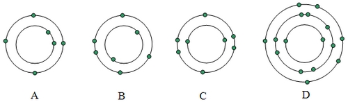 Katera shema prikazuje razporeditev elektronov v atomu kisika? Lupine so predstavljene kot krožnice okrog jedra.