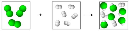 Oglej si shemo, ki prikazuje kemijsko reakcijo na nivoju delcev. Odgovori na vprašanja.