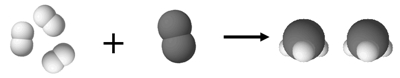 Oglej si prikaz kemijske reakcije na nivoju delcev. Odgovori na vprašanja.